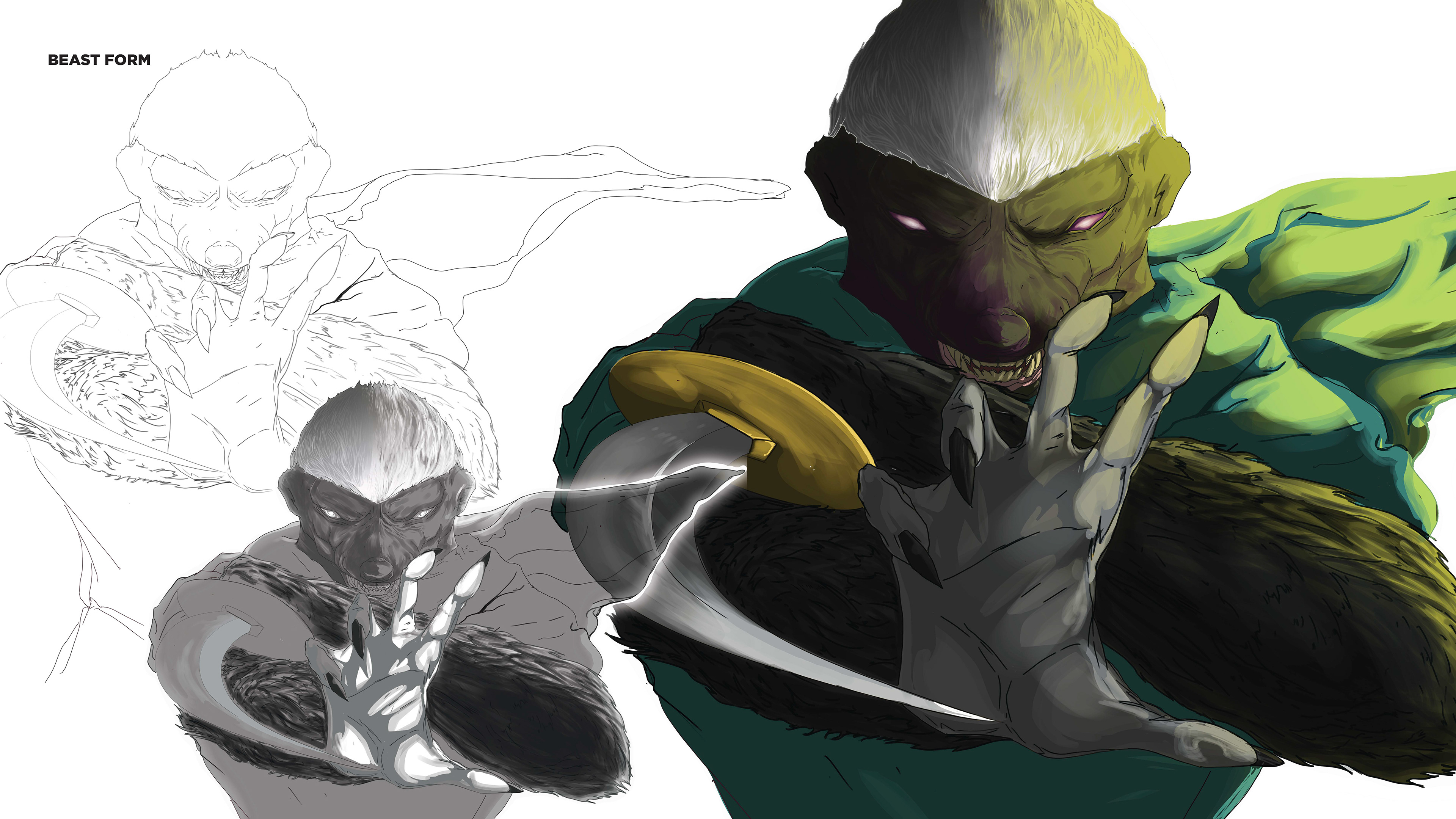In the upcoming comic book, Infinitum Tales, a race of supernatural beings take on three forms - human, beast, and berserk - with each form showcasing a different stage of their transformation. Na’bra the Ferocious - a woman with the power to transform into a honey badger, is the twin of Thelena, who transforms into a bear. Na’bra’s character is sleek and nimble, while also holding a firm and determined disposition, as opposed to her sister, who possesses more of a brute strength. Viking culture and apparel were referenced for both of the twins clothing and weaponry. See Thelena’s page for more details.